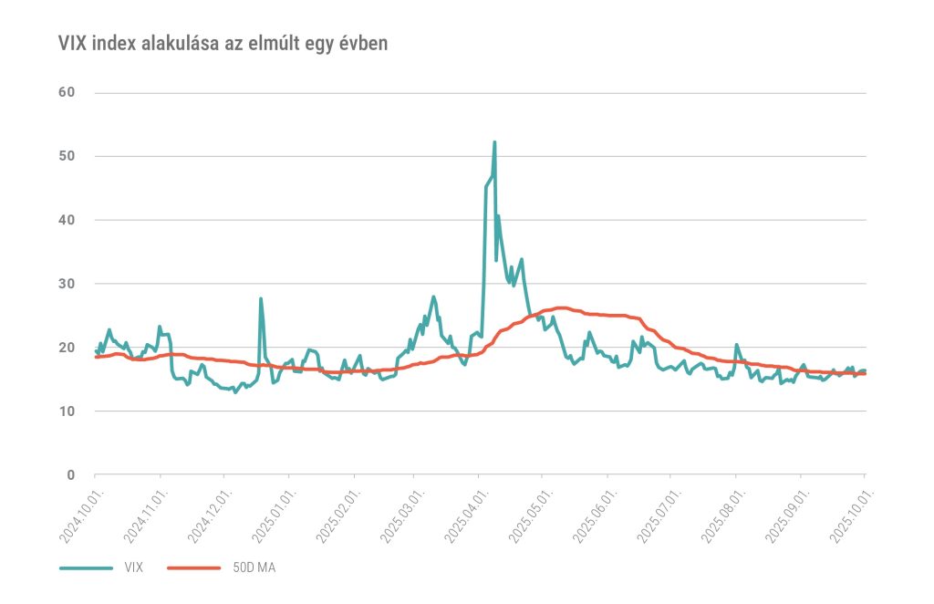 Ha az S&P500-as index esetében az elmúlt két évtized napi hozamingadozásait megvizsgáljuk (valamivel több, mint 5000 kereskedési nap), akkor azt látjuk, hogy a legnagyobb mozgású felső 5%-ba azok a kereskedési napok kerültek be (nagyjából tehát 250 kereskedési nap), ahol a napi változás +/- 2,4%-nál nagyobb volt. Egy átlagos negyedévben három ilyen kereskedési nap fordult elő, míg 2025 második negyedévében hét ilyen napot számolhattunk össze. Ehhez képest a harmadik negyedévben egyetlen ilyen napot sem találtunk. A negyedév legszembetűnőbb jellemzője talán éppen ez volt, a volatilitás teljes leülése. Ez persze részben magyarázható azzal, hogy a tőzsdei üzletmenet mindig lanyhább a nyári hónapokban, de szeptember sem hozta el a volatilitás megugrását. Az opciókba beárazott hozamingadozást mutató VIX index 15%-os érték köré csökkent, míg az elmúlt húsz kereskedési napból számolt realizált volatilitás mutatók még a 10%-ot sem érték el. Ezek évesített értékek és a részvénypiacok hosszabb távon megfigyelt, 17-18%-os éves volatilitásával érdemes összehasonlítani őket.