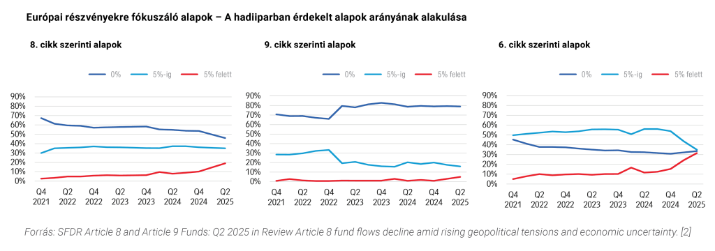 A 6. cikk szerinti alapokhoz képest a 8. cikk szerinti alapok kitettsége a hadiiparban továbbra is viszonylag alacsony a szigorú kizárási kritériumok miatt, míg a 9. cikk szerinti alapok közel nulla kitettséggel rendelkeznek az ebben az iparban tevékenykedő vállalatokban.