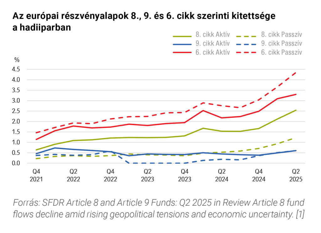 Az elmúlt három és fél évben mind az aktívan, mind a passzívan kezelt 6. és 8. cikk szerinti részvényalapok meredeken emelkedtek a hadiiparra vonatkozó kitettség tekintetében.