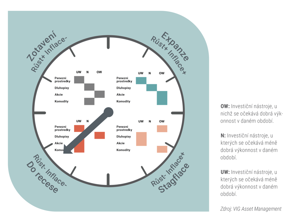 Hodinová ručička označuje hospodářský cyklus, ve kterém se právě nacházíme. Nevýrazné ručičky ukazují předchozí situaci.