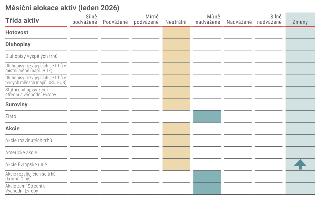 Provedli jsme změny v alokaci aktiv v souladu s nejnovějšími ekonomickými trendy a trendy na kapitálovém trhu. Schopnost generovat zisky u společností kótovaných na evropských burzách se může zlepšit, protože se očekává, že na stimulaci růstu bude vynaloženo mnoho veřejných prostředků. Ve fázi oživení hospodářského cyklu může dobře fungovat i trh se surovinami, přičemž faktory, které v roce 2025 poháněly cenu zlata, přetrvávají i dnes.