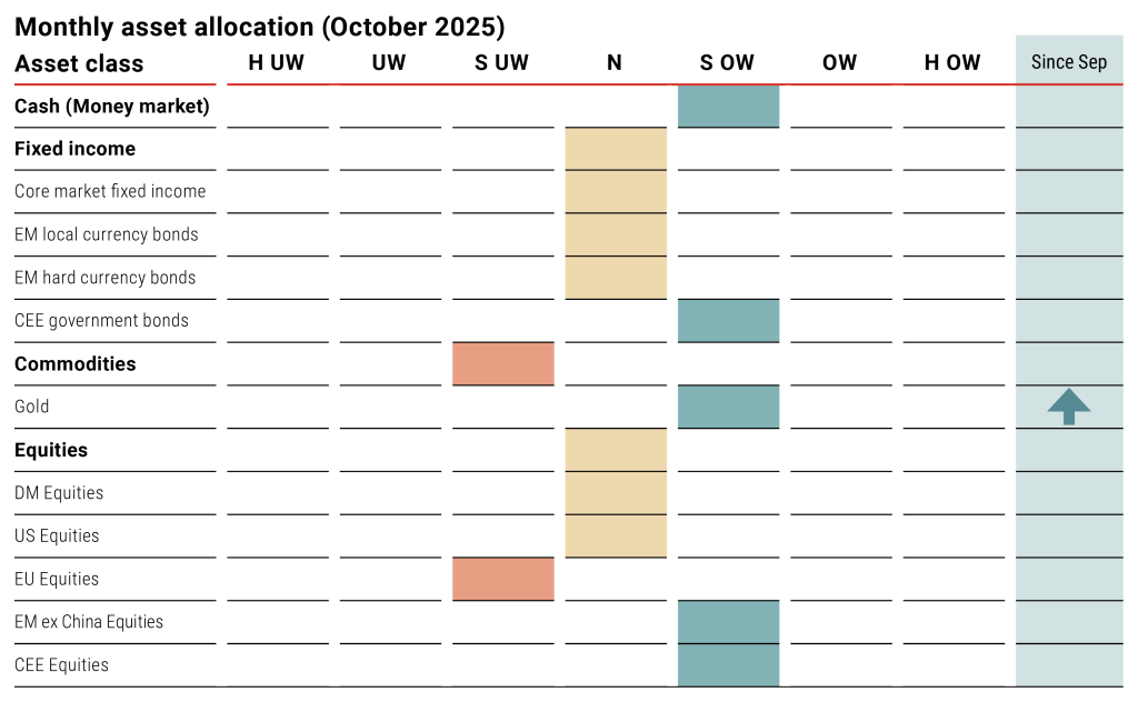 In Europe, inflation prospects remain favorable: eurozone inflation stood at 2.2% in September, with services leading the rise at 3.2% year-on-year. Unemployment is again at a historic low. The European Central Bank appears well-positioned to keep rates unchanged – with no immediate need for further tightening or easing.