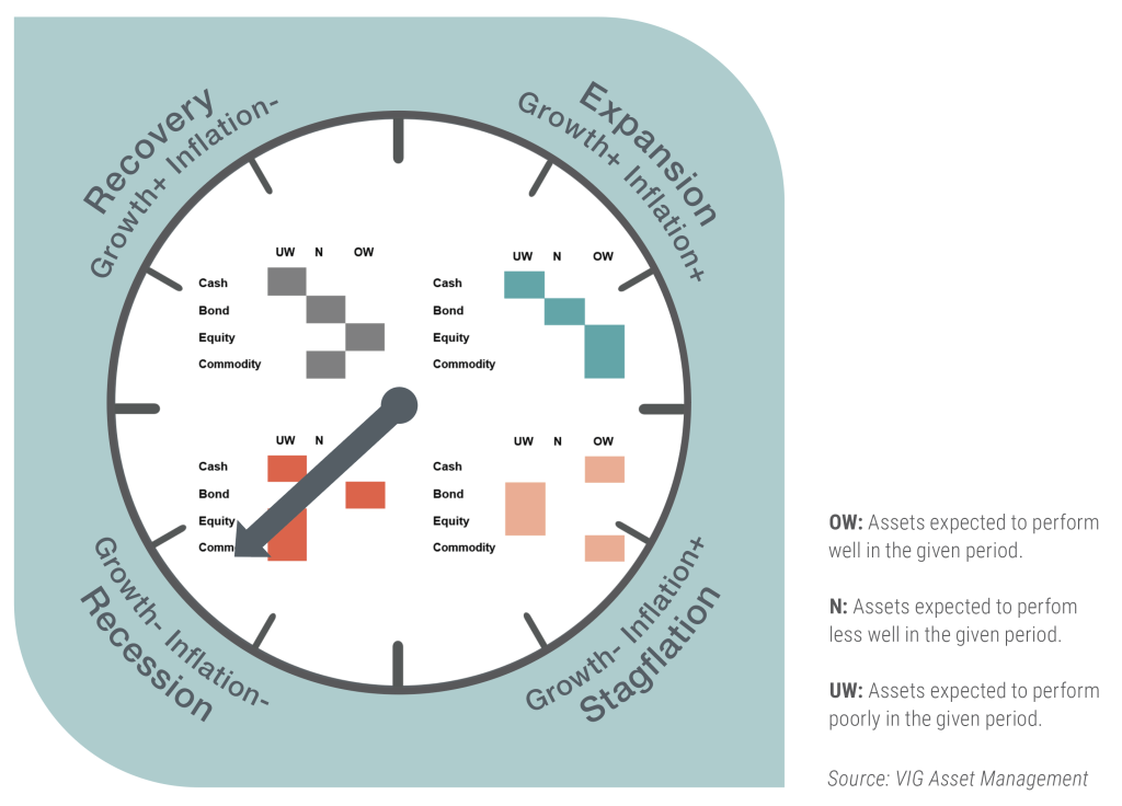 According to the latest signals from the VIG Asset Management Global Investment Clock, the global economy has entered a recessionary phase. While lower oil prices have helped ease inflationary pressures, overall growth expectations have weakened.