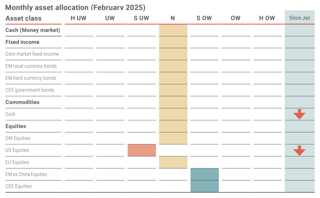 In line with the latest macroeconomic and capital market trends, we have made adjustments to our asset allocation. Optimism in U.S. equity markets appears excessive, prompting us to underweight. At the same time, commodities may perform well during the recovery phase of the economic cycle. Following the sharp surge in January, however, gold prices may be due for a short-term correction.