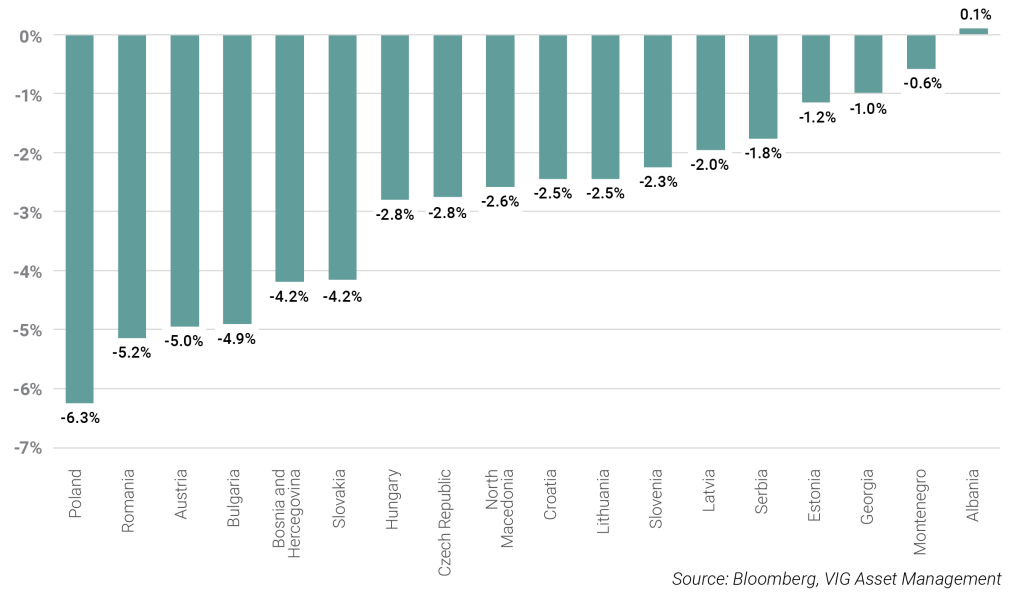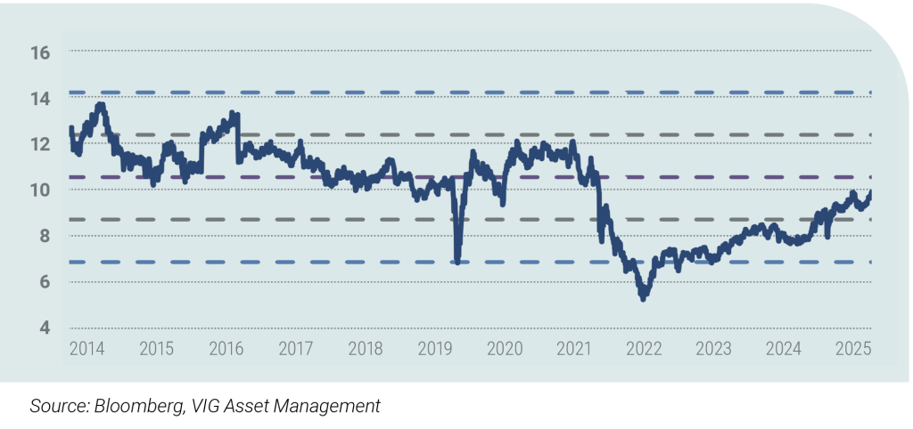 Although CEE equities are no longer as cheap relative to their own history—the war-related discount has largely faded—they continue to trade at a meaningful valuation discount compared with both developed and other emerging markets. While expected EPS growth for next year is currently the lowest in the CEE region, analysts have continuously revised their 2025 earnings forecasts upward across Czech, Polish, Hungarian, Austrian and Romanian corporates. As noted earlier, GDP growth across CEE remains below pre-crisis levels, and an eventual end to the war would likely support the broader economic environment and, by extension, corporate profitability. This combination suggests that the region still offers considerable upside potential for investors positioned in CEE equity markets.