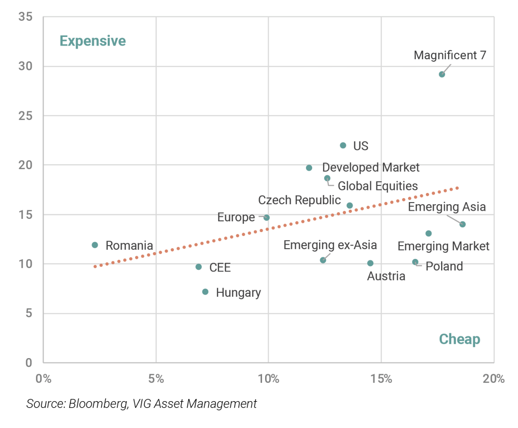 Global equity markets delivered exceptionally strong returns in 2025, and a continuation of this performance increasingly depends on the materialisation of more optimistic macro and earnings scenarios. As Benjamin Graham famously noted, long-term equity performance is driven primarily by dividend income and the trajectory of corporate earnings, though market valuation—such as the price-to-earnings (P/E) ratio of a listed company—also plays a critical role over extended horizons. On a P/E basis, most major equity markets now screen as expensive, with valuations in several regions sitting well above long-term averages, particularly in technology segments linked to artificial intelligence. A notable exception is the CEE equity market, where still single-digit P/E multiples remain below their 10-year norms, offering an attractive entry point. This is reinforced by the fact that earnings prospects for CEE corporates remain broadly favourable, further enhancing the region’s investment appeal.