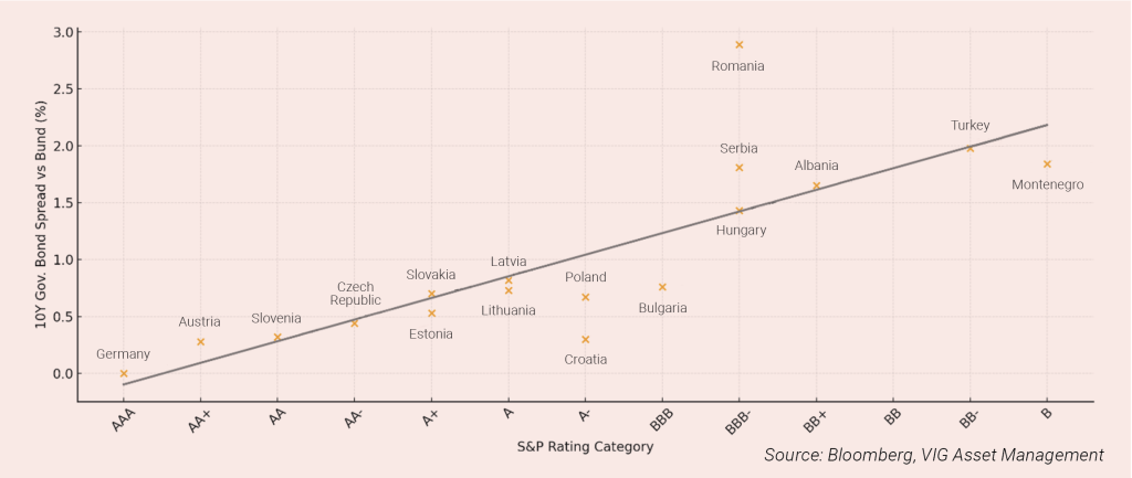 Regional sovereign spreads increasingly reflect the mounting burdens on public finances across several CEE economies. While there remains a broadly linear relationship between credit ratings and 10-year yield differentials, a number of countries stand out meaningfully from the trend. Romania, rated BBB–, trades with a spread of nearly 300 basis points—substantially wider than peers in the same rating bucket—indicating the market’s clear pricing of elevated political and fiscal risks, as well as the possibility of further downgrades; from a yield perspective, however, it offers one of the most notable carry opportunities in the region. Hungary and Serbia, both rated BBB–, also pay a sizeable premium of 140–180 basis points, reflecting a persistent political and fiscal risk premium. In a gradually stabilising macro environment, these spreads could become increasingly attractive for investors willing to take moderate risk.