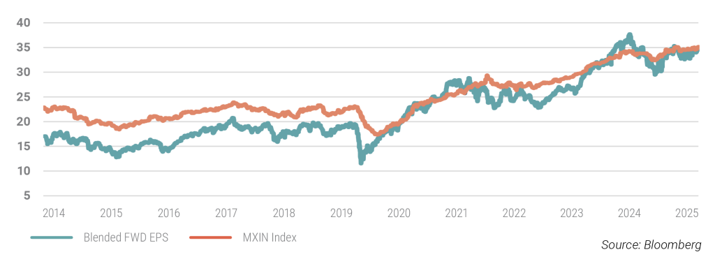 India – forward EPS (forward-looking earnings per share) and the performance of the MSCI India index (in USD)
