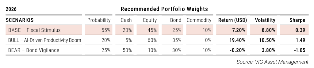 In the Bull Scenario (AI-driven Productivity Boom), we expect a 19.4% annual portfolio return in USD terms with 10.5% volatility. Equities are poised to deliver exceptionally strong returns in this environment, alongside with superior bond returns. Conversely, we anticipate that commodity prices could decline significantly in this scenario.