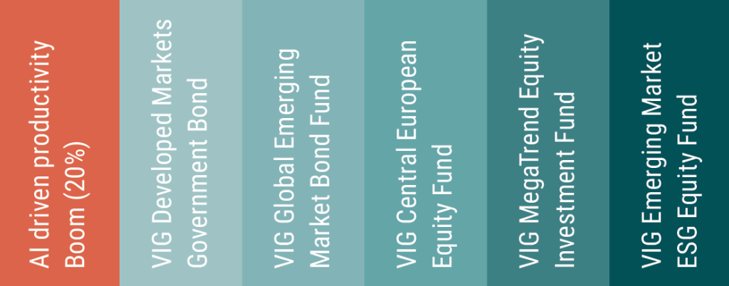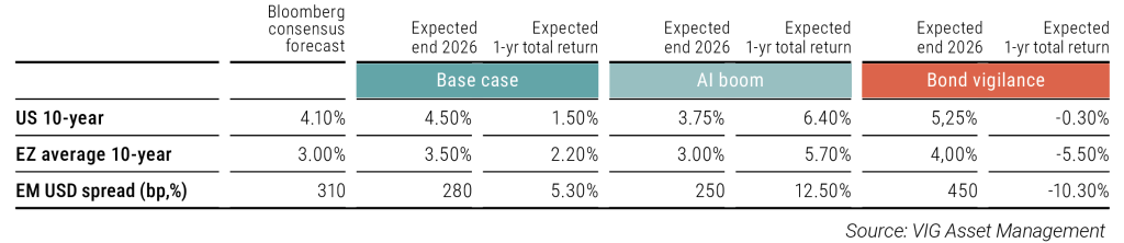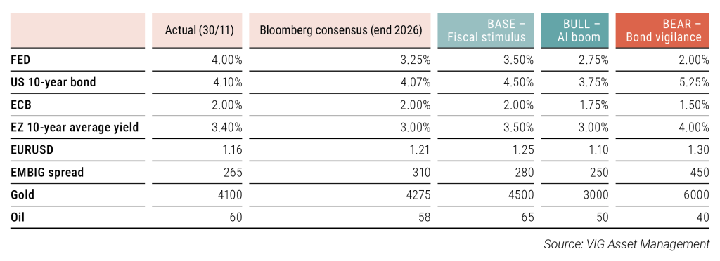 How do we go further? As it remains an impossible task to assess the whole spectrum of the probability distribution, in our 2026 outlook we focus on three themes that might come to the fore next year. Our base case covers a positive fiscal story, our bull case is about a world with an AI-driven productivity jump and the resulting low inflation while our bear case is about rising yields due to resurfacing global debt fears. These stories cover some of the known unknowns capital markets are facing. We admit our selection of themes is completely subjective: the world is more complicated and also there are many unknown unknowns waiting for us but we think it is important to play with the numbers and guide investors how a portfolio would fare if these real risks would materialize.