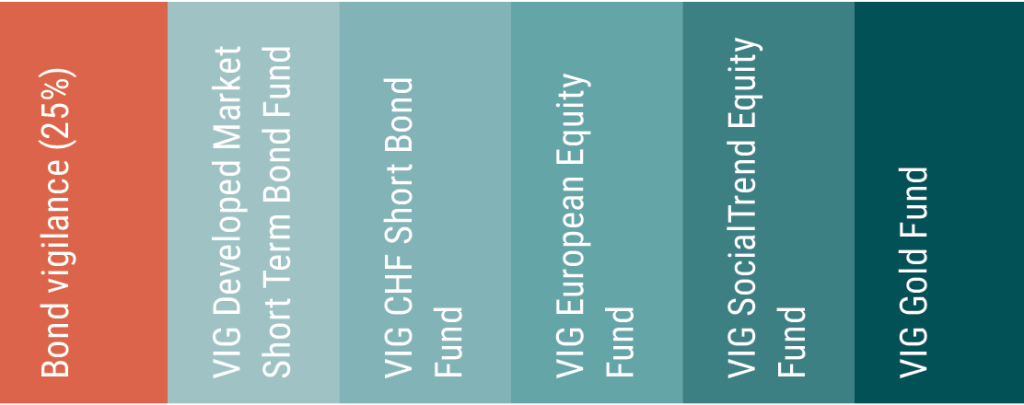 In the Bear Scenario (Bond Vigilance), we expect a –0.2% annual portfolio return in USD terms with 3.8% volatility. As higher bond yields weaken both equity and fixed-income performance, we anticipate mediocre returns across the two main asset classes. Commodity returns are expected to be slightly negative overall; however, we foresee exceptionally strong performance for gold and weak returns for crude oil.