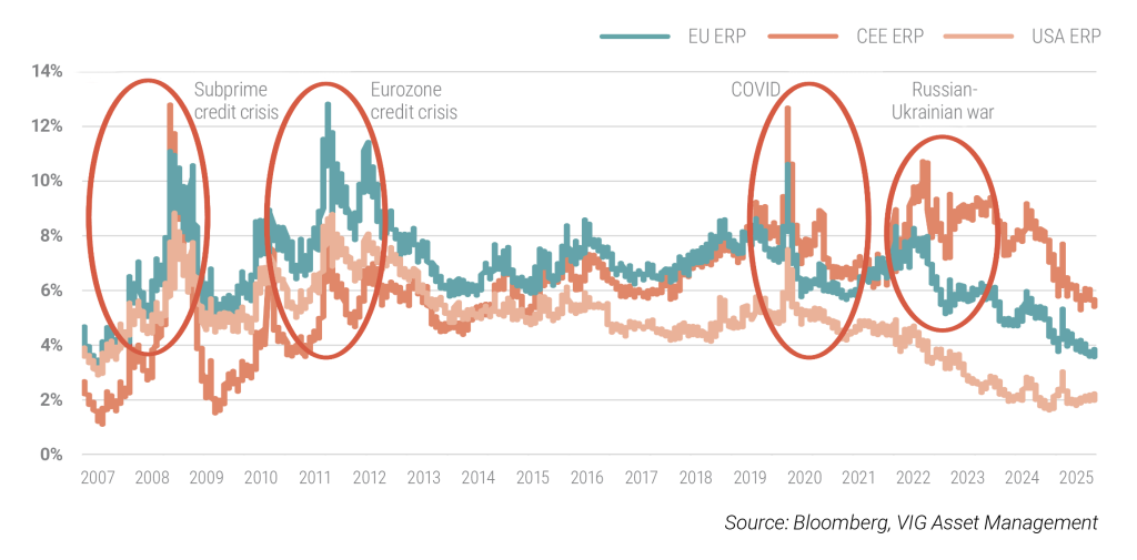 Another fundamental principle of equity investing is that valuations are poor short-term indicators—indeed, in the current rally, investors are not scrutinising technology-sector P/E ratios as closely as one might expect. Over longer horizons, however, valuations become key signals. The Equity Risk Premium (ERP) captures whether optimism or caution is priced into equities relative to bonds. As the chart below illustrates, U.S. equities have built up a level of optimism not seen since before the 2007 credit crisis, with an ERP of barely 1%. Historically, when the ERP has spiked—during the global financial crisis, the eurozone crisis, or the COVID shock—it has coincided with sharp corrections in equity markets. The same pattern emerged during the Asian financial crisis in 1997 and the bursting of the dot-com bubble in 2000. When equities become overvalued and the ERP falls too low, as it is today, subsequent drawdowns of 40–50% have not been uncommon.