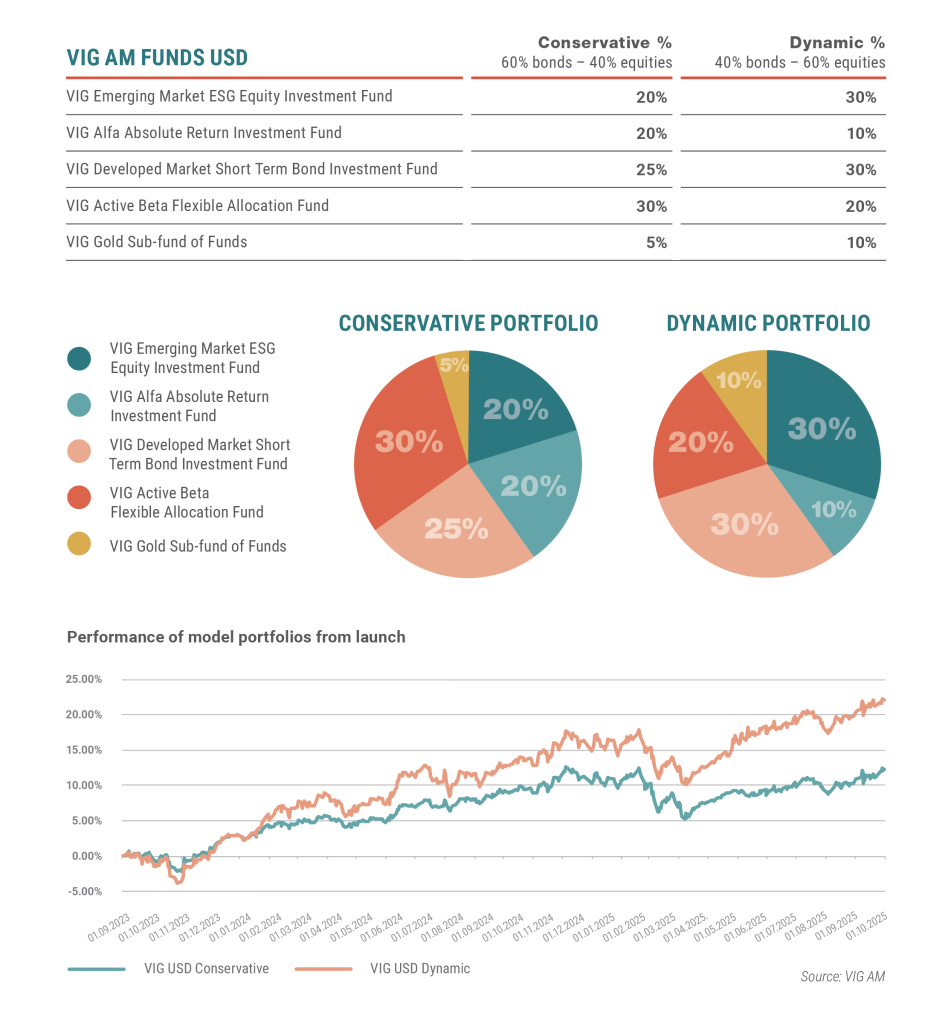 We have made similar tactical allocation adjustments in the USD-based model portfolios, driven by the same market considerations. In line with this approach, we also implemented changes in the EUR-based model portfolios: we increased the weight of the VIG Active Beta Flexible Allocation Fund, which invests in the most popular U.S. and European equities while maintaining strong risk management practices.