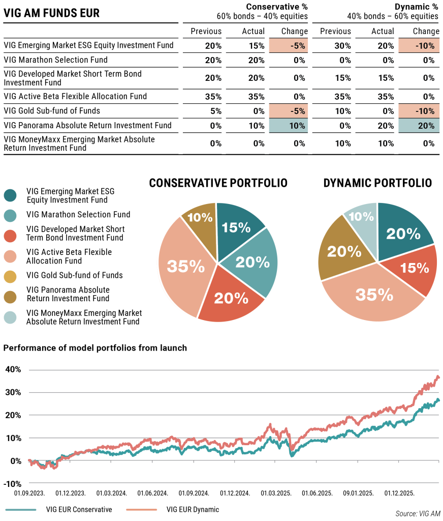 In response to market trends, we have adjusted the composition of our EUR-denominated portfolios. We have slightly reduced the weighting of the VIG Emerging Markets ESG Equity Investment Fund: due to the US-Iran conflict, investors’ risk appetite has declined, and emerging market equities are now less popular due to heightened caution.