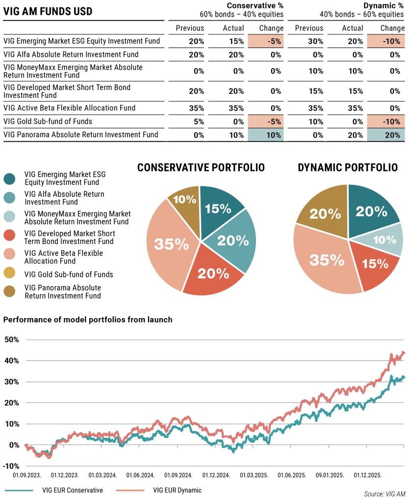 We have also made changes to the tactical allocation of the dollar-based model portfolio. The largest holding remains the VIG Active Beta Flexible Allocation Fund, which holds a significant proportion of the most widely traded European stocks while implementing robust risk management.
