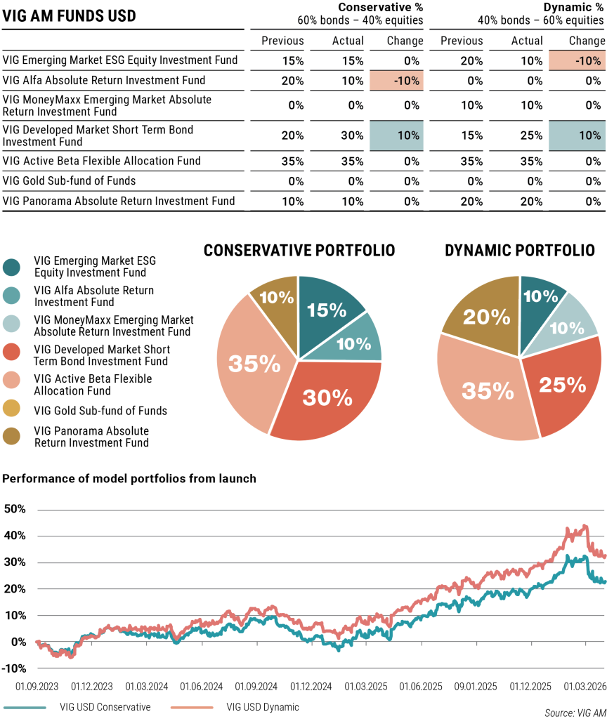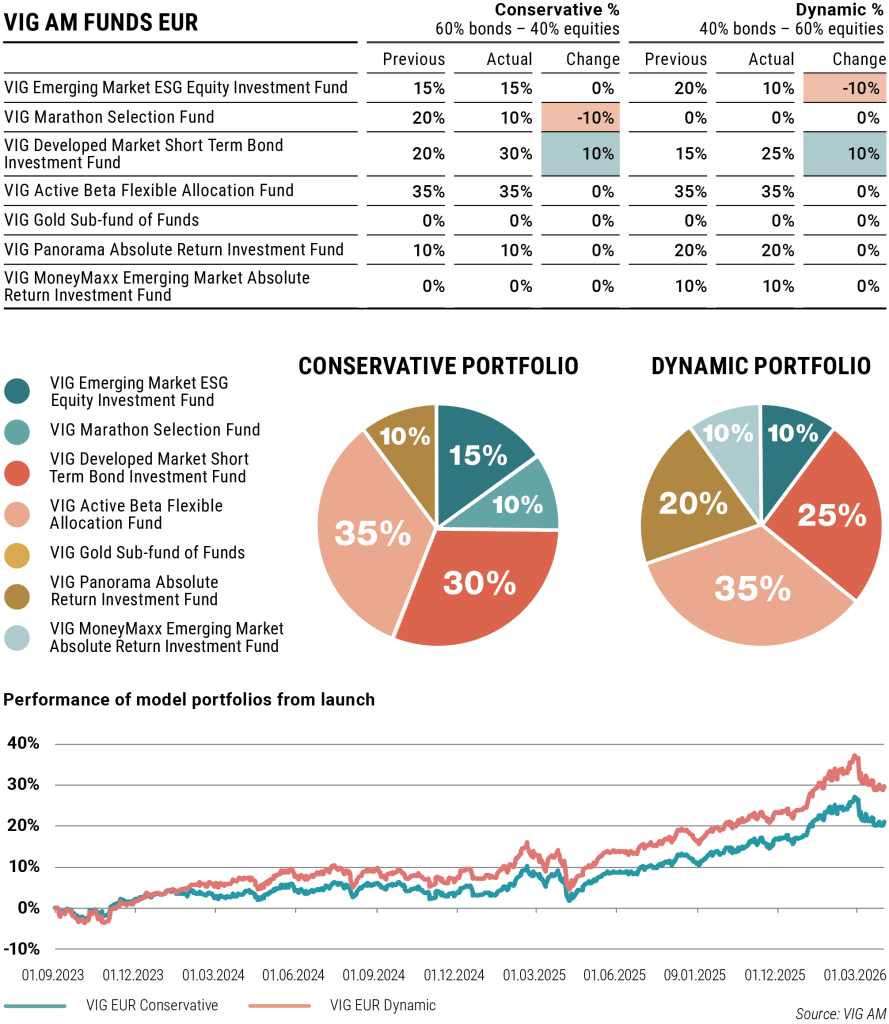 Here, too, we proportionally reduced the weight of the funds with riskier emerging market equity exposure ( the VIG Emerging Market ESG Equity and VIG Alfa Absolute Return investment funds), which now account for only 10% each of the total portfolio value.