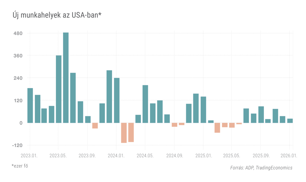 Bár az amerikai gazdaság a statisztikák alapján jól muzsikál – a bruttó hazai termék (GDP), amely az amerikai gazdaságban előállított összes áru és szolgáltatás összege, 4,3%-kal bővült a tavalyi harmadik negyedévben és az Atlanta FED “GDPNow” előrejelzése alapján az év utolsó 3 hónapjában is 4% feletti lehetett a növekedési ütem – a munkaerőpiac alulteljesít. A magánvállalkozások az ADP intézet felmérése szerint 2026 januárjában mindössze 22 ezer új munkahelyet teremtettek, a lefelé módosított 37 ezer fős decemberi számnál is kevesebbet, ami jócskán elmarad a 48 ezer fős növekedésre vonatkozó előrejelzésektől. A gazdaság motorját adó szolgáltatási szektorban 57 ezer, a politikailag fontos feldolgozóiparban pedig 8 ezer munkahely szűnt meg – utóbbi szektor 2024 márciusa óta minden hónapban folyamatosan veszít munkahelyeket. A munkahelyteremtés 2025-ben jelentős mértékben visszaesett: a magánszektor tavaly csak 398 ezer új munkahelyet teremtett, szemben a 2024-es 771 ezerrel. Mindez megágyaz a vállalatokat és a családokat mérsékeltebb hitelköltségek révén támogató jegybanki kamatcsökkentésnek, amit minden bizonnyal támogat majd a májusban hivatalba lépő új Fed-elnök, Kevin Warsh is. Őt ugyanis a régóta alacsonyabb kamatokat támogató Donald Trump jelölte a pozícióra. A jelenlegi Fed-vezér, Jerome Powell tartózkodóbb: januárban a szövetségi alapkamat a korábbi 3,5%–3,75%-os céltartományban maradt, hogy kordában tartsa az inflációt.