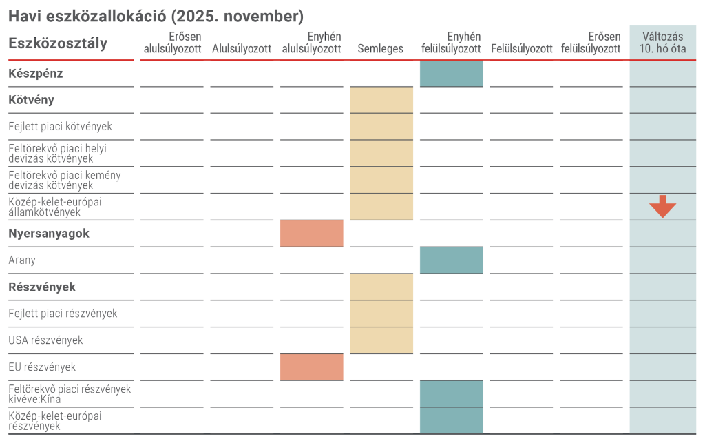 A közép-európai kötvények hozama csökkent, árazásuk már kevésbé kedvező, ezért súlyukat semlegesre csökkentettük. Az amerikai Fed szigorúbb irányváltása és az amerikai kamatcsökkentési várakozások csökkenése miatt a kelet-közép-európai regionális kötvények versenyelőnye csökkent, kilátásai gyengültek. A befektetők fokozatosan profitot realizáltak a magyar államkötvényeken is, mivel a 2026. áprilisi országgyűlési választások előtt – az infláció fékentartása miatt erős forintot preferáló kormánystratégia miatt – nem számítanak érdemi kamatcsökkentésre (ezen egy belengetett amerikai-magyar pénzügyi megállapodás ugyanakkor érdemben változtathat), ami támogathatja a rövid- és középlejáratú hozamokat. A választások előtt várható fiskális lazítás viszont megemelheti a hosszú lejáratú hozamokat, ami jelentős kockázat, mert a magyar kötvények külföldi állománya többéves csúcson van.