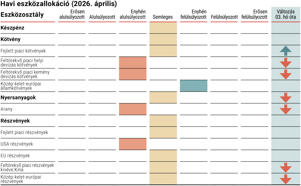 Az olajárak az iráni konfliktus kitörése után az egekbe szöktek, ami jelentősen megnövelte a kötvénypiaci hozamokat. A gazdasági kilátások jelenleg a stagflációs forgatókönyvhöz közelednek, a rövid távú inflációs várakozások jelentősen megugrottak, ami a Fed kamatcsökkentéseit árazza. A recessziótól való félelmek tovább erősödhetnek, ha az olajárak tartósan magasak maradnak, ezért a hosszú távú hozamok emelkedése várhatóan korlátozott lesz a jövőben. Ez viszonylag magas hozammal és egy esetleges kamatcsökkentéssel együtt jó nyereséggel kecsegtet. Az amerikai és európai tőzsdék ugyanakkor a háború vártnál gyorsabb lezárása esetén teljesíthetnek jól: a várakozások szerint április elején az USA mellett Irán is hajlandó véget vetni a háborúnak, amennyiben elegendő biztonsági garanciát kap.