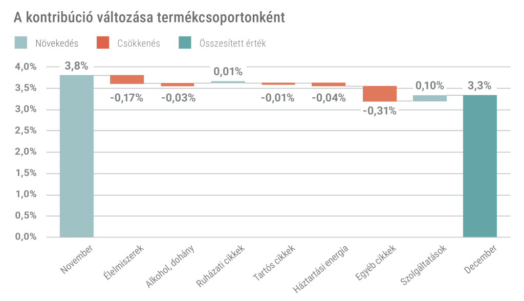 A fogyasztói kosáron belül főként az élelmiszerek év/év drágulásának lassulása és az egyéb cikkek, üzemanyagok árának év/év csökkenése járult hozzá a fő inflációs mutató csökkenéséhez, és a szolgáltatások kivételével a kosár többi részében is inkább a dezinfláció jelei voltak megfigyelhetők decemberben. A szolgáltatások december havi jelentős drágulása nem megszokott jelenség, hiszen szezonális hatások miatt inkább alacsonyabb áremelkedés figyelhető meg ilyenkor. A legfőbb áremelkedés a szolgáltatásokon belül a teherszállításhoz és a telekommunikációs szolgáltatásokhoz köthető.