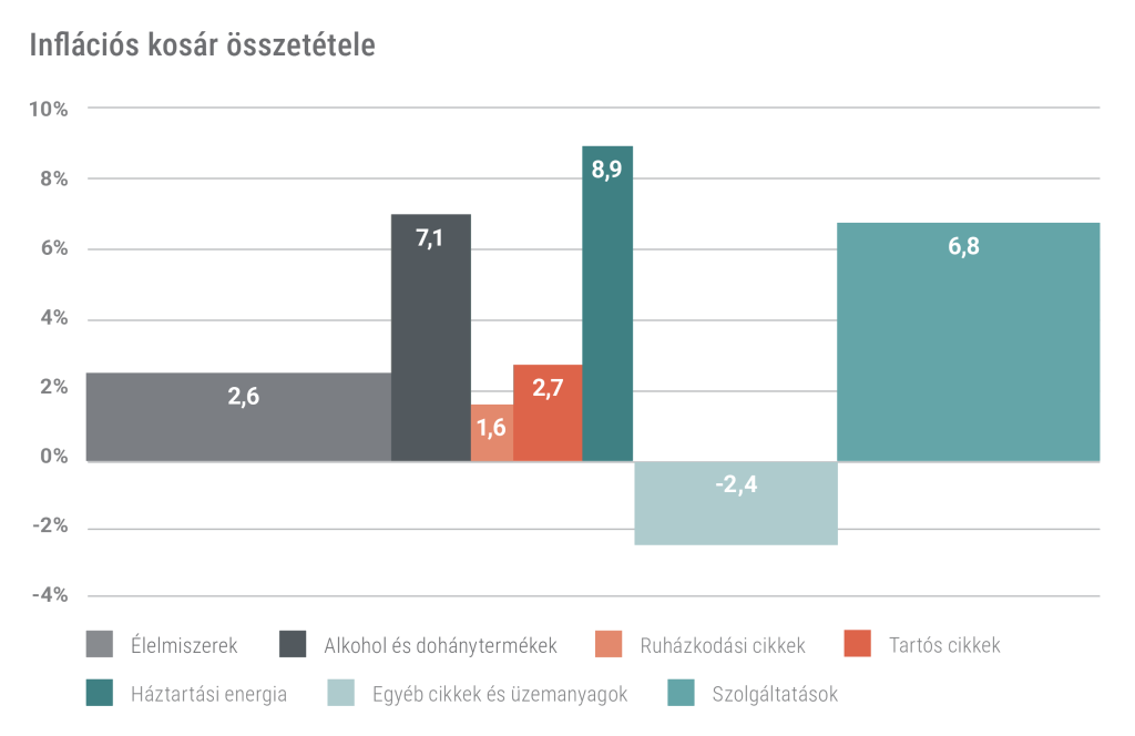 Az inflációs kosár két meghatározó eleme az élelmiszer (2,6%) és a szolgáltatások (6,8%), legkiemelkedőbb árváltozás azonban az alkohol és dohányáruk (7,1%) és a háztartási energia (8,9%) esetében jelentkezett.