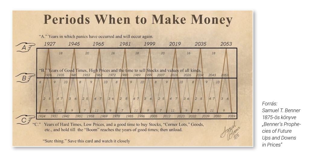 Ezek közül az egyik legérdekesebb és leghosszabb ideje működő megközelítés a Benner-ciklus, amely a múlt század során meglepően stabil modellnek bizonyult. A Benner-ciklust 1875-ben dolgozta ki Samuel Benner, aki mezőgazdasági gazdálkodóként és elemzőként a 19. századi árupiacokon megfigyelhető visszatérő prosperitási, válsági és pánik-ciklusokra építette fel hosszú távú piaci ritmusmodelljét.