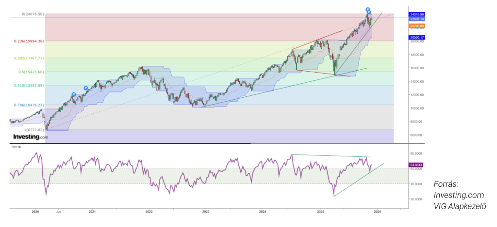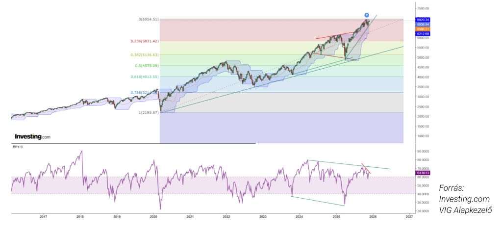 A hosszú távú S&P 500-kilátásokat vizsgálva jól látható, milyen jelentős ralival járult hozzá ez a vezető részvényindex az elmúlt évek részvénypiaci teljesítményéhez. A technikai kép alapján közeledünk az Elliott-elmélet szerinti ötödik hullám végéhez a 2025-ös emelkedő szakaszban, amely azonban még nem feltétlenül zárult le. Az index az idei évben parabolikus ívre váltott, amit az RSI mutató gyengülő piaci erőt jelző alacsonyabb csúcsai is kísérnek – ez összességében korai figyelmeztető jelzés lehet a következő év egészére nézve.