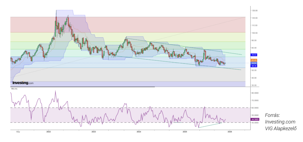 A WTI továbbra is hosszú távú csökkenő trendben mozog és a jelenlegi kilátások szerint ez a tendencia folytatódhat. Ugyanakkor a lefelé tartó trend meredeksége az utóbbi időben oldalazó mintázatra váltott, amely a 60-80 dolláros sávban tartja az olaj árfolyamát. Az emelkedő RSI azt is jelzi, hogy a több éve tartó lejtmenet ereje fokozatosan gyengül, így nagy valószínűséggel ez a kereskedési tartomány határozhatja meg a WTI mozgását 2026 során is.