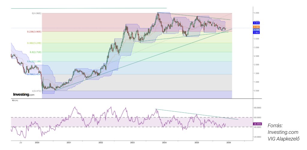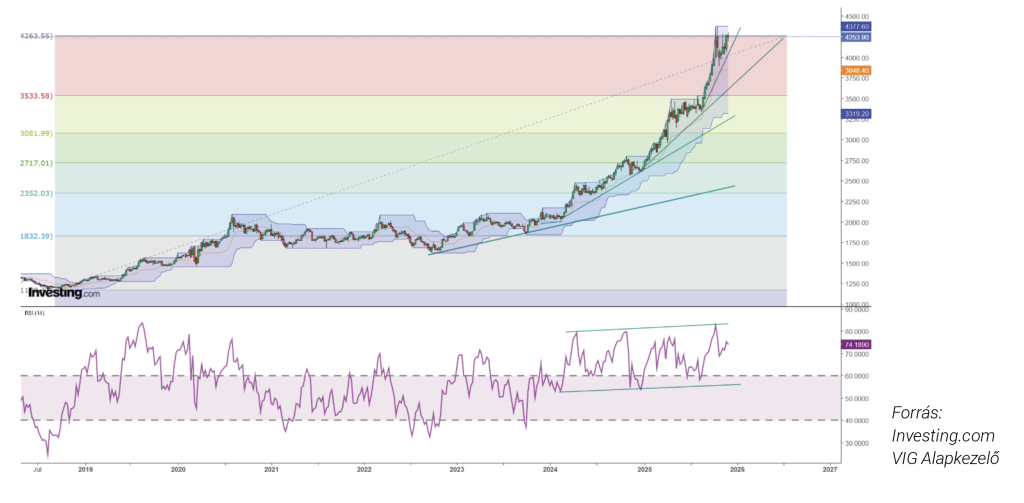 Az arany az elmúlt években rendkívül erőteljes emelkedést produkált – olyat, amely a részvénypiacok egyidejűleg hasonlóan jó teljesítményéhez viszonyítva rendkívül szokatlannak számít. Az árfolyammozgás parabolikussá vált, amit az RSI extrém értékei is alátámasztanak. Az ilyen környezet általában túlárazott piacot jelez, amely fokozottan kitett lehet egy buborékszerű korrekciónak. Bár ez a fordulat egyelőre nem látszik egyértelműen a grafikonon, egy olyan erőteljes lefelé történő árfolyammozgás, amely 2026 során 40 alá nyomja az RSI-t, könnyen felgyorsíthatja az árfolyamkorrekciót.