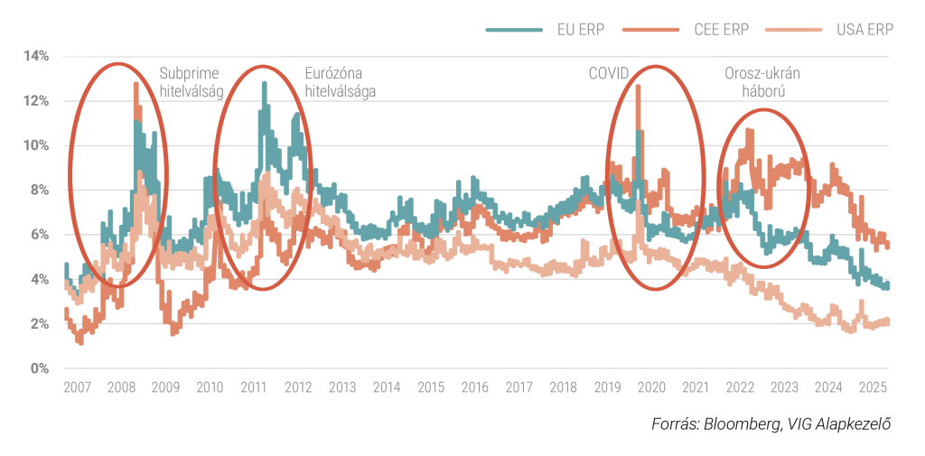 Egy másik tőzsdei alaptörvény, hogy a részvénypiaci árazás rövid távon nem jó indikátor (például a mostani tőzsdei hosszban sem a technológiai vállalatok P/E mutatóit böngészik árgus szemekkel a befektetők), hosszú távon azonban fontos befektetési iránytű. A Részvény Kockázati Felár (ERP) megmutatja a részvényekben felépült befektetői optimizmust vagy pesszimizmust a kötvényekhez képest. A lenti ábra alapján elmondható, az amerikai részvényekben jelenleg a 2007-es hitelválság óta nem látott optimizmus épült fel és nagyon alacsony, körülbelül csak 1% a részvénykockázati felár, amelynek a hitelválságban, az eurózóna válságában vagy a COVID idején hirtelen megugrása mögött komoly részvénypiaci esés állt. Ugyanez történt az ázsiai hitelválság idején 1997-ben, majd a dotcom lufi kidurranásakor 2000-ben is. Egy válság idején a részvények leértékelődnek, és ha az ERP túl alacsony, mint jelenleg, akkor ez akár 40-50%-os tőzsdei esésekhez is vezethet. 2026-ban ettől függetlenül tovább emelkedhet az amerikai részvénypiac, de ha valami megváltozik a befektetői percepcióban, vagy egy addig nem látott új kockázat kerül felszínre, akkor szinte garantált a nagyon komoly részvénypiaci újraárazódás a kötvényekhez képest, jöhet a medve piac. Jelenleg nem ez az alapforgatókönyvünk, de érdemes ezzel tisztában lenni.