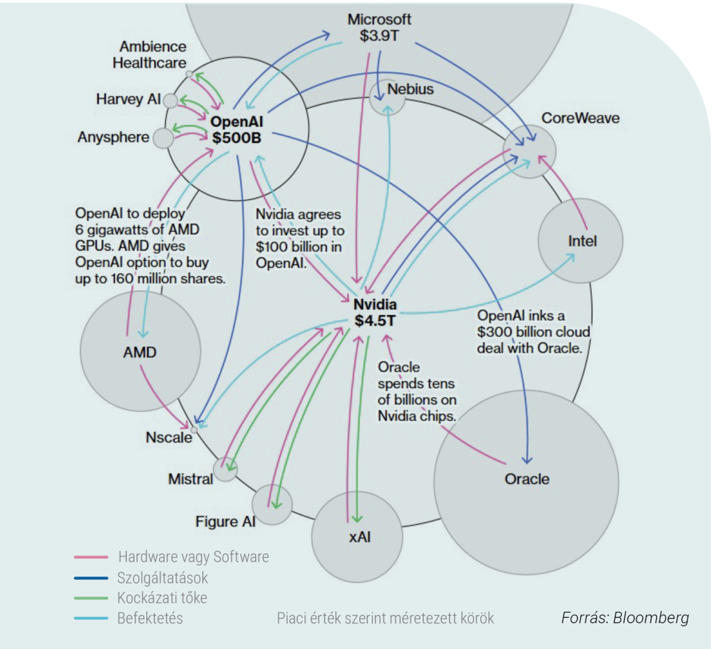 Az Nvidia, az OpenAI és több technológiai óriás olyan körkörös, egymást finanszírozó partnerségekre építi az AI-beruházási boomot, amelyek már önmagukban is több száz milliárd dollárt mozgatnak, és összességében könnyedén elérhetik az 1 billió dolláros nagyságrendet. A konstrukciókban a vállalatok egyszerre jelennek meg befektetőként, beszállítóként és ügyfélként. A jelenség lényege, hogy ugyanazok a szereplők egyszerre adják és kapják a pénzt: egy cég befektet egy másikba, amely azt a pénzt később visszakölti olyan szolgáltatásokra vagy eszközökre, amelyeket épp a befektető cégtől vásárolna meg. A pénz így gyakorlatilag körbejár a rendszerben – mintha mindenki egymástól vásárolna, fenntartva a növekedés látszatát, miközben a tényleges megtérülés jóval lassabban jelentkezik. Ez a szorosan összefonódó üzleti hálózat egyre inkább a dotkomkorszak túlkapásaira emlékeztet, különösen azért, mert a mögöttes AI-technológia monetizációja és valódi profitabilitása egyelőre elmarad a beruházások ütemétől.