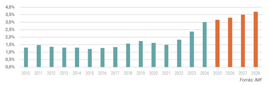 Emellett az adósságszolgálatra fordított kiadások is meredeken nőnek: kamatkiadásra a GDP arányában 2024-ben 3,0%-ot költöttek az USA-ban, ami meredek emelkedést jelent a korábbi évekhez képest . A jelenlegi makrogazdasági előrejelzések alapján a következő években tovább emelkedik az adósság után fizetett kamatok mértéke az USA-ban. Mindezek a folyamatok az USA hitelminősítői besorolásának romlásában is testet öltöttek: 2023-ban a Fitch rontotta AAA-ról AA+-ra, 2025-ben pedig a Moody’s Aaa-ról Aa1-re (az S&P már 2011-ben lerontotta az USA elsőrendű adósminősítését).