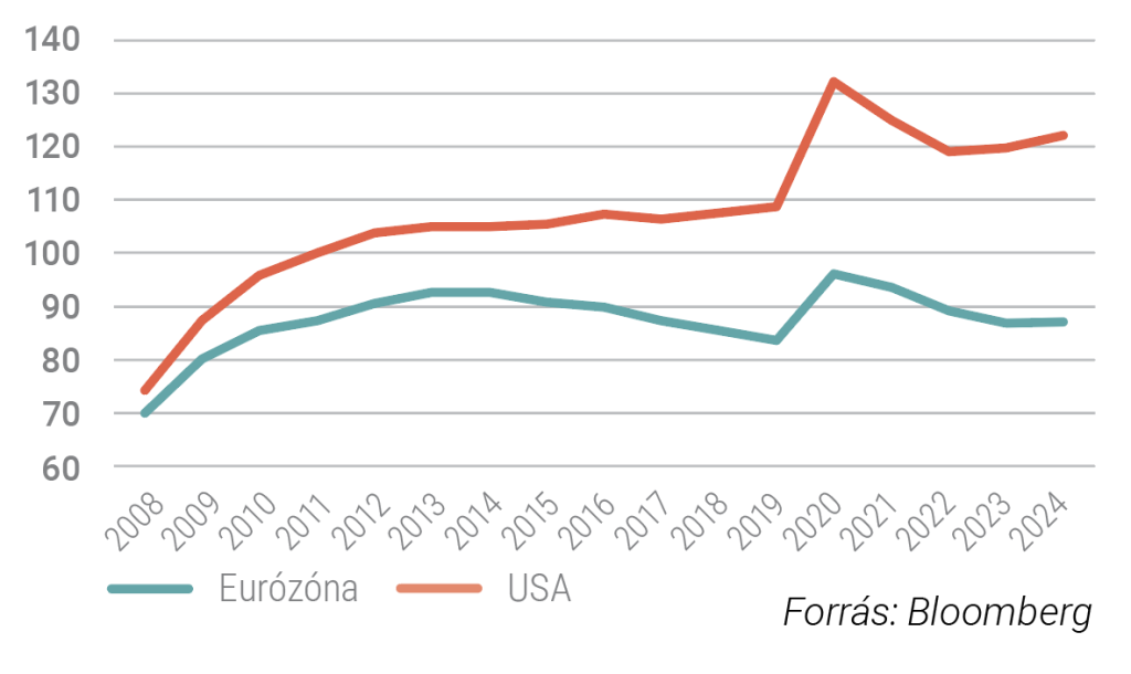 Az intézkedések hatására az adósságszintek Európában a 2010-es évek második felében mérséklődtek, az USA-ban pedig jelentősen lassult az államadósság növekedési üteme. Az eladósodottságban a következő robbanást 2020 és a Covid hozta el: az USA-ban 109%-ról 130% fölé, az Eurózónában pedig 84%-ról 97%-ra emelkedett az átlagos GDP arányos adósságszint. A Covid óta viszont divergencia van a két gazdasági régió között: az Euróövezetben közel 10 százalékponttal mérséklődött az adósságszint, az USA-ban viszont a várakozások szerint 2025 végére 125% közelébe emelkedhet a GDP arányos államadósság.