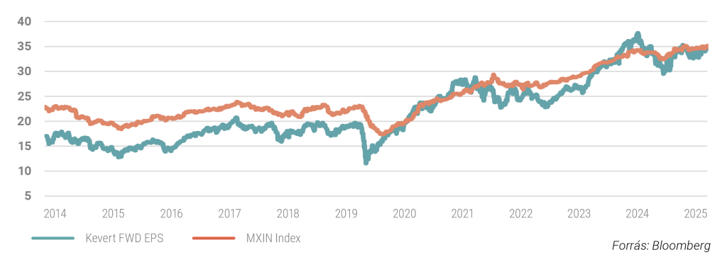 India – FWD EPS (előremutató egy részvényre jutó nyereség) és az MSCI India index alakulás (USD-ben)