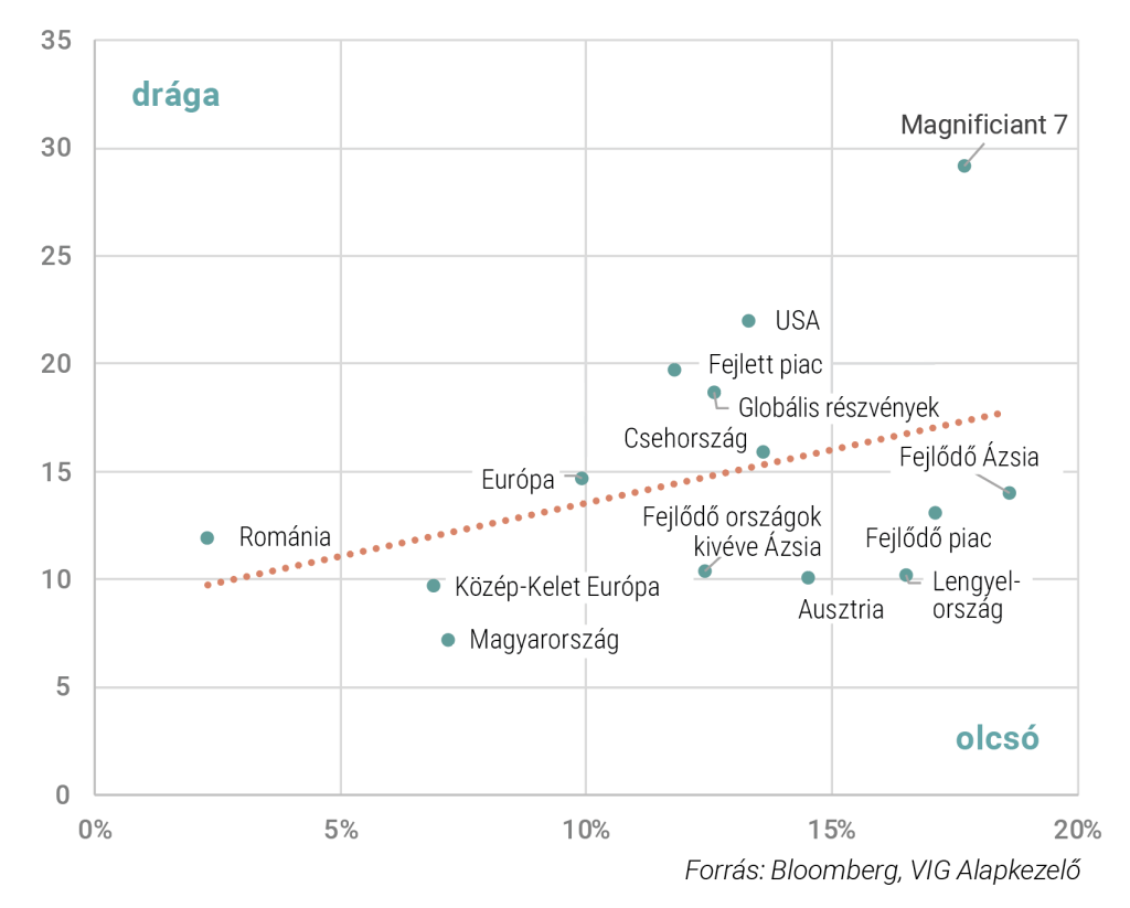 A globális részvénypiacok kiemelkedő teljesítményt nyújtottak 2025-ben, és ennek fennmaradása egyre inkább attól függ, hogy megvalósulnak-e az optimistább makrogazdasági és vállalati eredményforgatókönyvek. Ahogy Benjamin Graham klasszikusan megfogalmazta, a hosszú távú részvénypiaci hozamokat elsősorban az osztalékjövedelem és a vállalati profitok alakulása határozza meg, ugyanakkor a részvények értékeltsége – például az árfolyam/nyereség arány (P/E) – szintén kulcsfontosságú tényező. Jelenleg a legtöbb globális részvénypiac drágának tekinthető ezen mutató alapján, különösen az AI-kapcsolt technológiai szegmensekben, ahol a P/E-értékek jóval a hosszú távú átlag fölé emelkedtek. Kivételt képez a közép-kelet-európai régió, ahol az egyszámjegyű P/E mutatók továbbra is a 10 éves átlag alatt találhatók, ezáltal kedvező belépési pontot teremtenek. Ezt tovább erősíti, hogy a régiós vállalatok eredménykilátásai összességében kedvezőek maradtak.