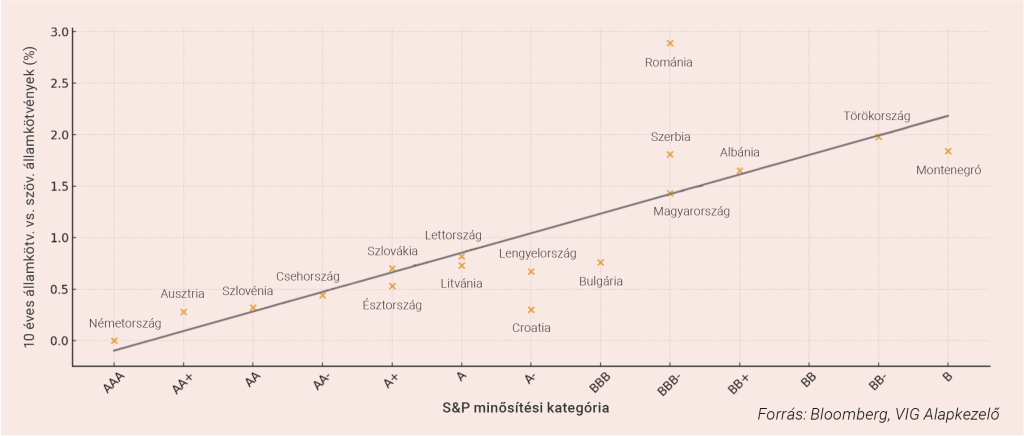 Szuverén hitelminősítés vs. 10 éves kötvények kamatkülönbsége (trendvonallal)