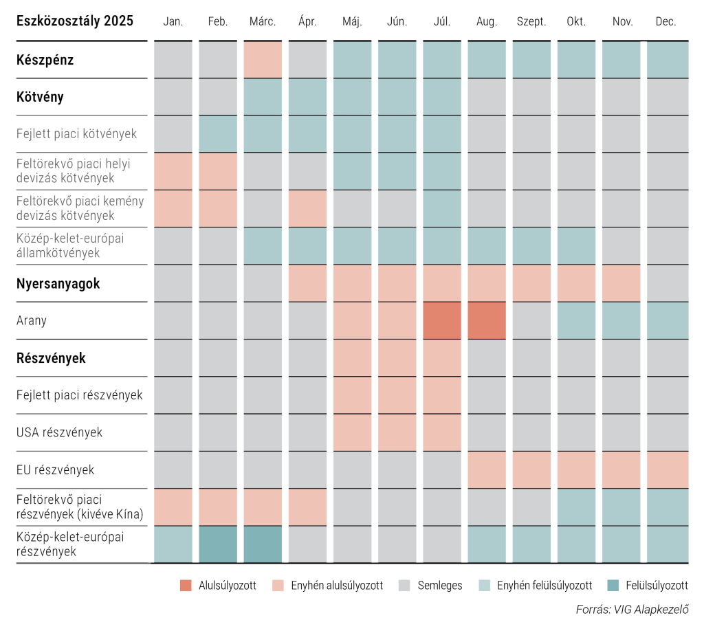A 8,96%-os nominális EUR-hozamhoz és a kiváló relatív teljesítményhez elsősorban a nyersanyag- és részvényallokáció járult hozzá. A nyersanyag szektor alulsúlyozása, valamint az arany időben meghozott le-, majd felminősítése – különösen az őszi árfolyam-emelkedés időszakában – jelentősen támogatta a portfólió hozamát. A részvények esetében a CEE-régió, – amely 2025-ben a legjobban teljesítő részvénypiac volt, – felülsúlyozása, valamint az év elején még jól teljesítő, később azonban alulteljesítő európai részvények alulsúlyozása bizonyult meghatározónak. Az amerikai részvények töretlen erősödése és a nyári alulsúlyozásuk sem rontotta érdemben az összteljesítményt, mivel a dollár gyengülése tompította a negatív hatást.