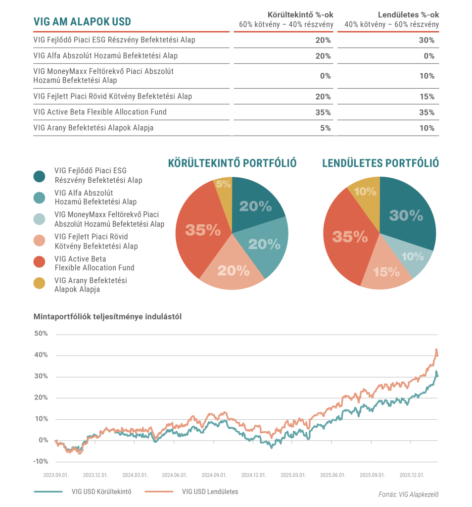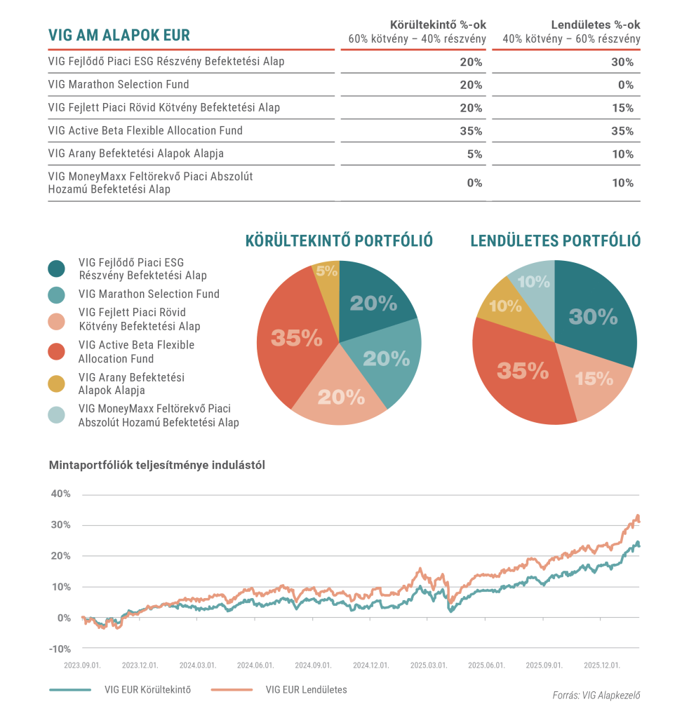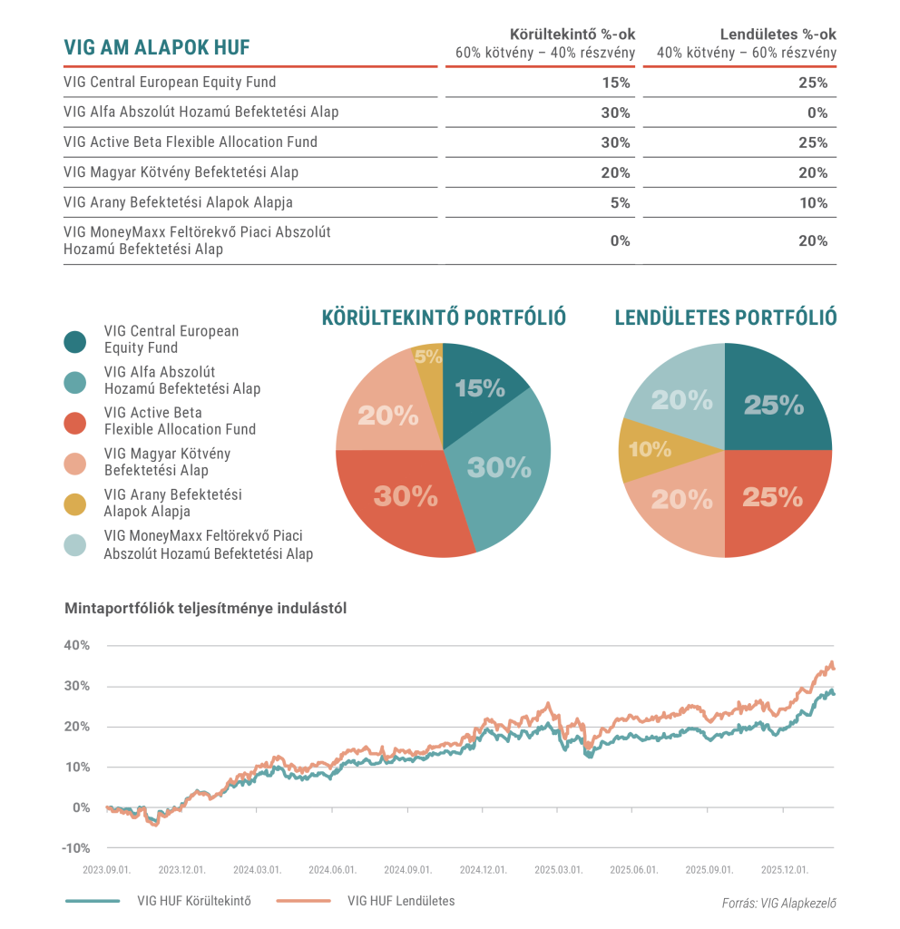 Mindkét portfóliónkban csökkentettük a VIG Central European Equity Fund és a legnépszerűbb amerikai és európai tőzsdei részvényeket vásárló VIG Active Beta Flexible Allocation Fund súlyát. Utóbbiban ugyanis jelentős kitettséget biztosít a legkurrensebb mesterséges intelligencia-vállalatok részvényei irányába is, azonban az ezeknek platformot biztosító Wall Street mai állás szerint már túlértékeltnek tekinthető. Az így felszabaduló pénzt az óvatosabb befektetési stratégiát követő VIG Alfa Abszolút hozamú Befektetési Alapba tettük, míg a kockázatvállalóbb lendületes portfólióban VIG MoneyMaxx Feltörekvő Piaci Abszolút Hozamú Befektetési Alapból vásároltunk jelentősebb mennyiséget: a fejlődő országok tőzsdéi olcsók, vállalataik növekedési kilátásai viszont magasabbak, mint a fejlett országokban.